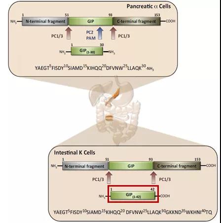 在血糖处于正常范围或低血糖状态时,GIP促进胰高血糖素分泌;但当机体处于高糖状态时,GIP可抑制胰高血糖素分泌,与GLP-1共同促进胰岛素分泌。